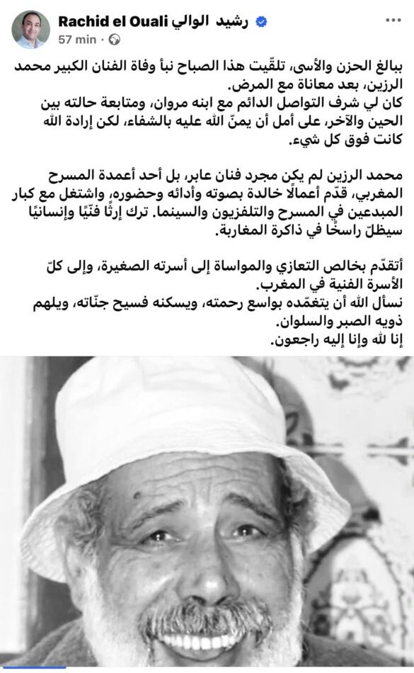 ونعى الفنان رشيد الوالي الراحل عبر تدوينة على حسابه الرسمب بمواقع التواصل الاجتماعي، قائلا: “ببالغ الحزن والأسى، تلقّيت هذا الصباح نبأ وفاة الفنان الكبير محمد الرزين، بعد معاناة مع المرض”.